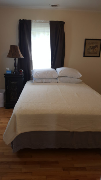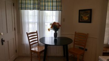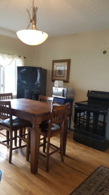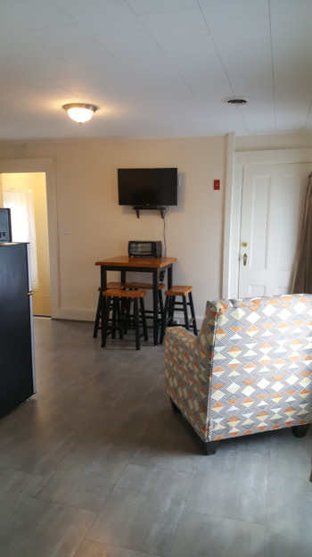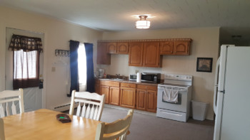 In our common living area located on the first floor, you will find a comfortable couch and chairs. An adjacent area with pub style table provides seating for eight people. Other amenities include a Kitchen sink and dishware, Glass Stove top oven, microwave, refrigerator and coffee maker with plenty of countertop space for entertaining guests. The front porch provides a place to relax outdoors on Adirondack chairs. Picnic tables and charcoal grills are available for all guests to use upon request.