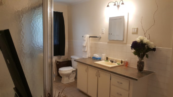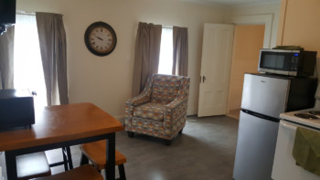 Unit 18 is a lovely unit on the first floor with 2 bedrooms -three queen beds in total (One of the bedrooms has a door for added privacy from the other rooms), kitchen and a large private bathroom. Each bedroom includes a smart flat screen TV with cable, lounge chair and alarm clock. The kitchen is equipped with a compact medium sized fridge/freezer, microwave, sink, table, pantry and all the basic kitchen amenities one might need.